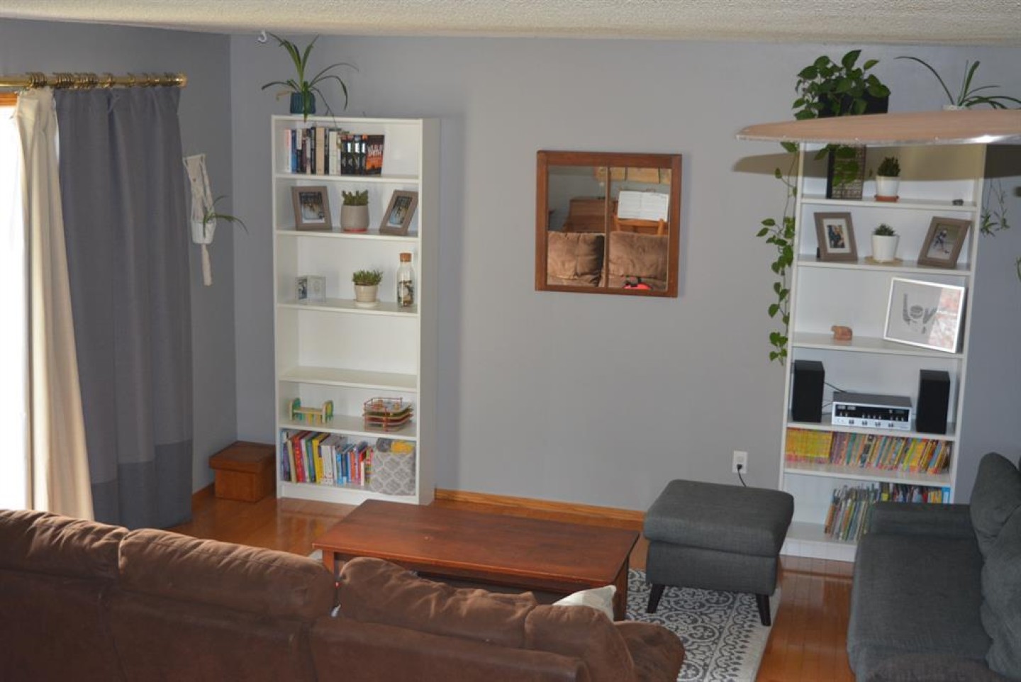 Microwave, window blinds, shelves above desk, bar stools, curtains in first upstairs bedroom to the right